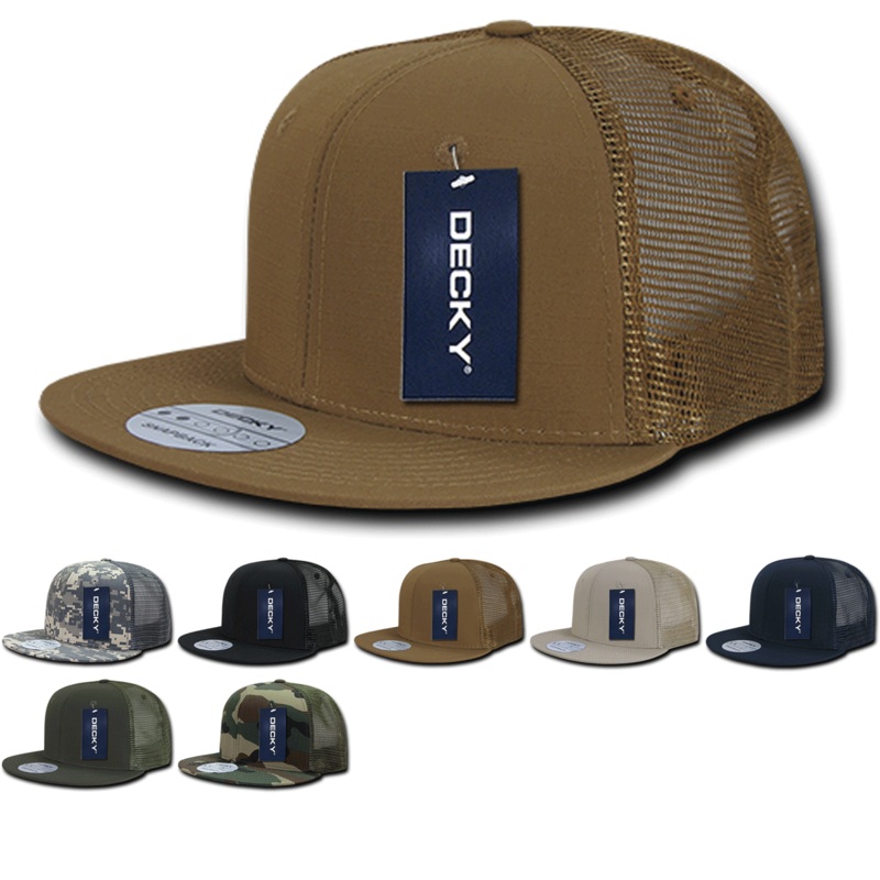 The Ripstop Flat Bill Trucker Cap, 6 Panel Ripstop Trucker Hat features a unique fabric made of 100% cotton, with a special reinforcing technique making it resistant to tearing and ripping. It has rear mesh panels, an integrated cotton sweatband, 8 rows of stitching across a flat bill and is finished with a classic plastic snap closure.