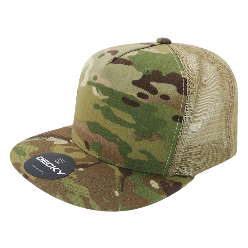 Decky 6304 - Multicam 5 Panel Trucker CapThe MultiCam 5-Panel Trucker Hat, Camo Flat Bill Trucker Cap is a 5 panel structured cap, built to last with its ripstop material. Cap features an integrated cotton sweatband, stitched ventilation eyelets, mesh back