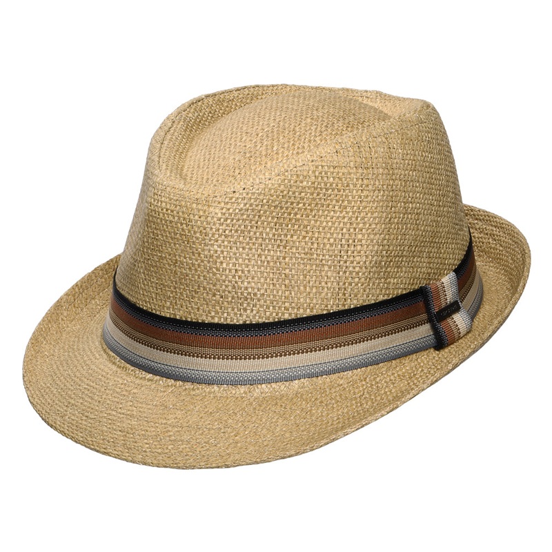 The Dorfman Pacific Monsoon Matte Toyo Straw Trilby Hat in natural is an eye-catching summer hat. The unique weave of the straw gives this hat a subtle difference that looks great and stands out from the crowd. A Circa 1921 hat pin is affixed to the side of the striped hat band. Lastly this trilby is fully lined with a thin fabric for comfort.