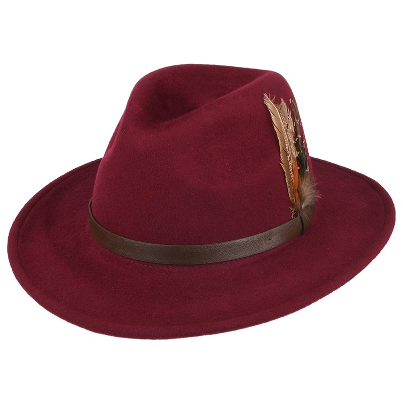 The Failsworth Hats Cheltenham Showerproof Wool Felt Fedora Hat in merlot will be your new wardrobe staple. Made of 100% wool, the hat is unlined and has an adjustable sweatband for comfort and a perfect fit. This hat is adorned with a faux leather hat band and feathers on the side. The outer material has been coated to enhance water repellency and stain resistance. The brim is approximately 7cm wide and the crown measures approximately 11.5cm high. A beautiful hat for the season.