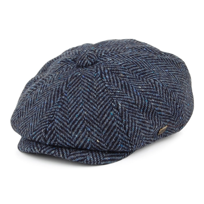This is the Malmo Donegal Tweed Herringbone Newsboy Cap in blue-multi from Failsworth. This beautiful newsboy cap has a big herringbone pattern, which gives this cap its distinctive look. It has a sewn down brim and a removable side pin. In the inside is a quilted lining and a grosgrain sweatband for extra comfort.