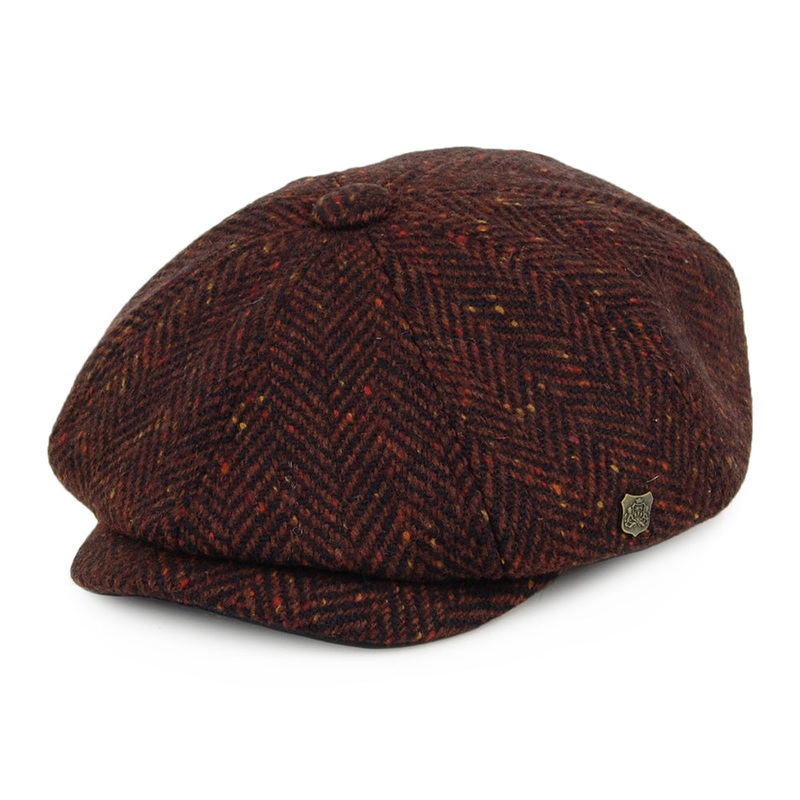 This is the Malmo Donegal Tweed Herringbone Newsboy Cap in burgundy multi from Failsworth. This beautiful newsboy cap has a big herringbone pattern, which gives this cap its distinctive look. It has a sewn down brim and a removable side pin. In the inside is a quilted lining and a grosgrain sweatband for extra comfort.