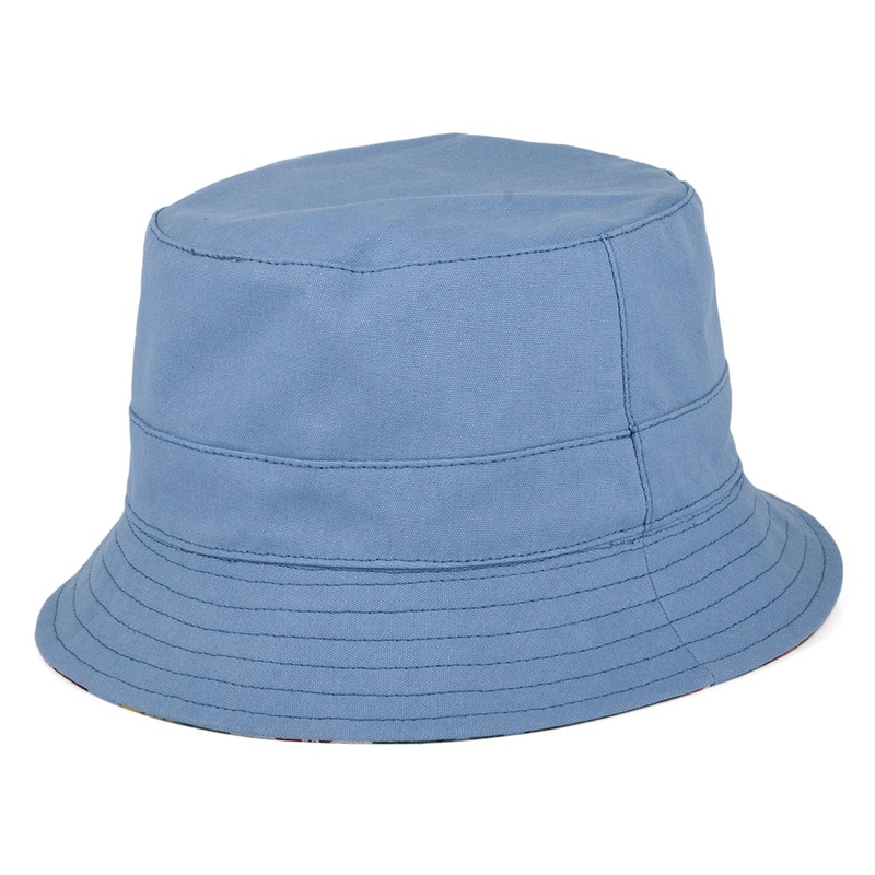 The Failsworth Hats Reversible Cotton Bucket Hat in sky blue is reversible so it has two very unique looks. One side features a tropical print and the other side is a solid sky blue colour. You can roll this hat up for easy packing.