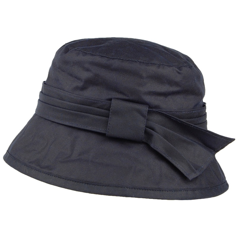 This is the Wax Cotton Bucket Hat with Side Bow in navy blue from Failsworth. This beautiful bucket hat is made of waxed cotton which makes it a great rain hat. The hat is decorated with a stylish side bow. The inside is lined with quilted satin and satin sweatband.