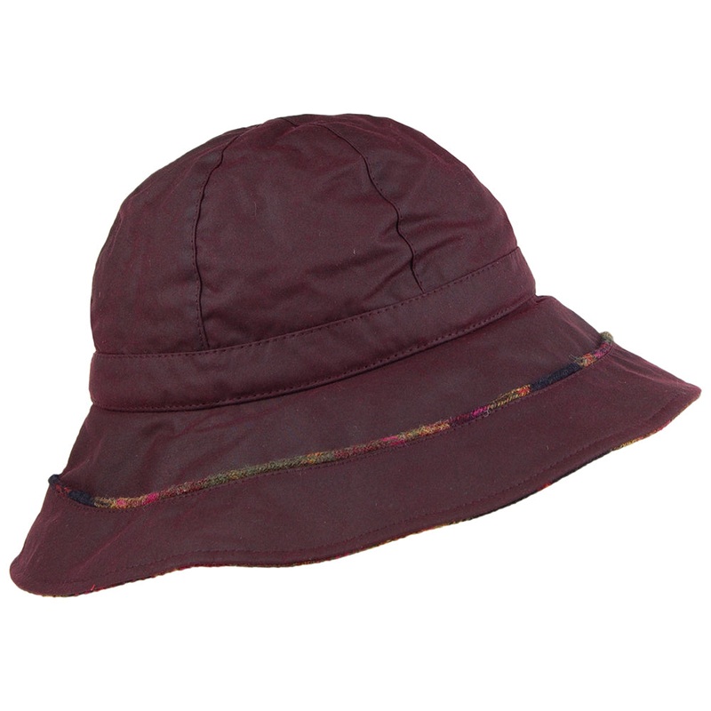 This is the Wax Cotton Tartan Trim Bucket Hat from Failsworth in merlot. This beautiful bucket hat is made of waxed cotton which makes it a great rain hat. The hat is decorated with a tartan brim which is also reflected in the underbrim. The inside is lined with quilted satin and satin sweatband.