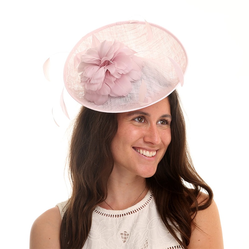 The Jane Anne Carnation Disc Fascinator in orchid is a lovely style for formal occasions and weddings. This fascinator is composed of sinamay straw and features a group of feathers. The entire design sits on top of a satin covered alice band.
