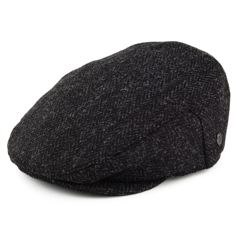 This is the HARRIS TWEED Dunvegan Herringbone Flat Cap from Jaxon & James in black-charcoal. This great new genuine HARRIS TWEED style is made of 100% pure new wool, that has been dyed, spun and handwoven in the Outer Hebrides of Scotland. For extra comfort this hat has a quilted satin lining and a grosgrain sweatband. On the side is the Jaxon & James pin attached. The crown is sewn down to the visor. The Dunvegan is an outstanding flat cap by the brand Jaxon & James!