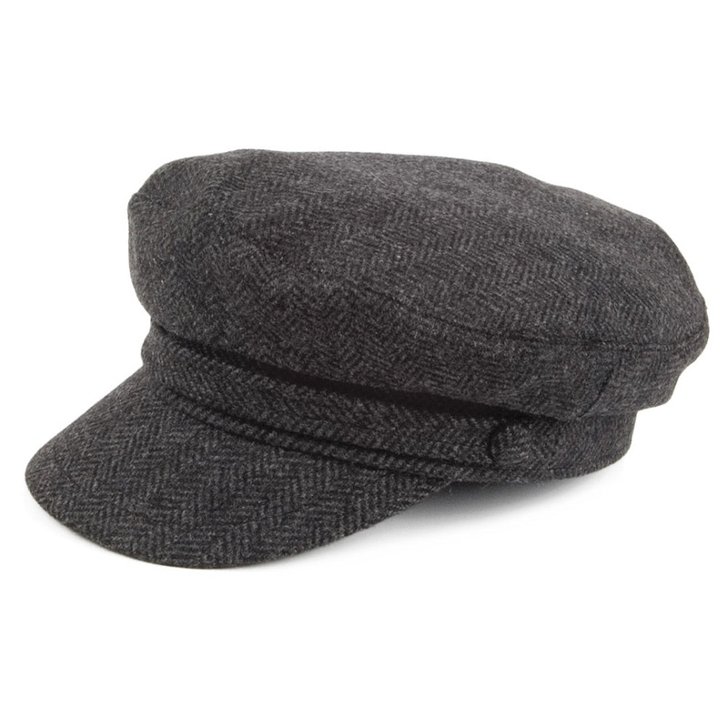 The charcoal Herringbone Fiddler cap by Jaxon & James hats is made out of 50% wool and 50% polyester. This trendy piece of head wear is fully lined and there is a sweatband for maximum comfort. There are self covered buttons on either side of the cap and a band across the front of it.