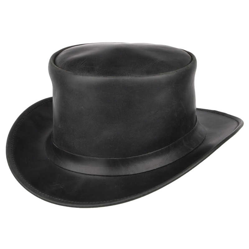 The Jaxon & James Leather Top Hat in black stands alone due to its slightly flared shallow 10.5cm high crown. The curved brim is wired and measures approximately 5cm wide. The hat is made of a thick durable leather which you can see and feel the quality immediately upon getting it into your hands. Unlined, it features an elasticized sweatband for a comfortable fit and is finished with a leather trim band at the base of the crown.