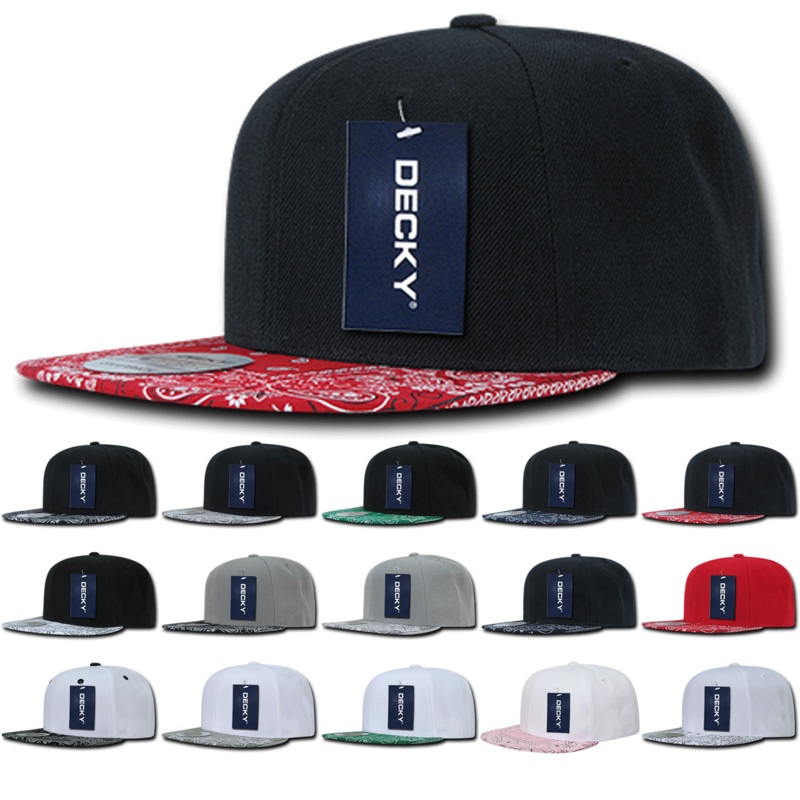 The Lot of 12 Decky Bandana Bill Paisley Snapback Hats Flat Bill Caps Bulkis a 6-panel structured cap featuring a colorful and unique paisley design on the bill. Comes with an integrated cotton sweatband, stitching across the bill and six top ventilation eyelets. The cap sports a retro flat bill and a plastic snapback closure.
