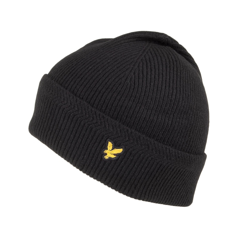 The Racked Rib beanie in black by Lyle & Scott is versatile and durable. It is a rib knit and is made out of a lambswool mix. There is a Lyle & Scott logo stitched on the cuff and the beanie measures 19.5cm from top to bottom.