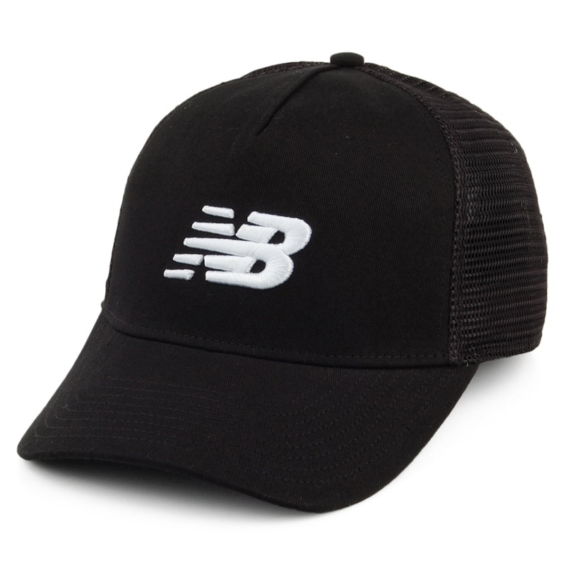 The New Balance Hats Sport Essentials Trucker Cap in black features the New Balance logo embroidered in 3D on the structured cotton front. The back of the cap features mesh panels, a New Balance flip tag and an adjustable snap for a perfect fit.