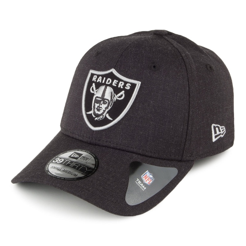 39THIRTY CapThis New Era 39THIRTY Las Vegas Raiders Heather Essential in black heather cap has the team logo embroidered on the front and the New Era flag is embroidered on the left. As its a 39THIRTY, it comes with a pre-curved brim and an elastic band so
