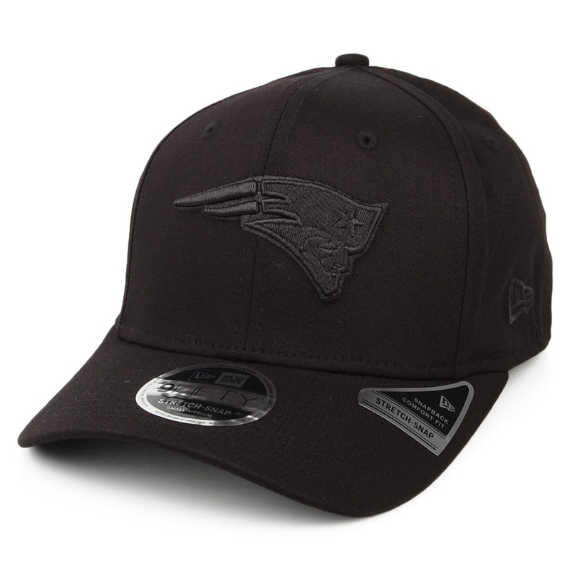This is the New Era 9FIFTY New England Patriots Snapback Cap Stretch Snap in black. The cap features the team's logo embroidered on the front. The New Era flag is embroidered on the side. There is an adjustable snap at the back and an elastic sweatband so