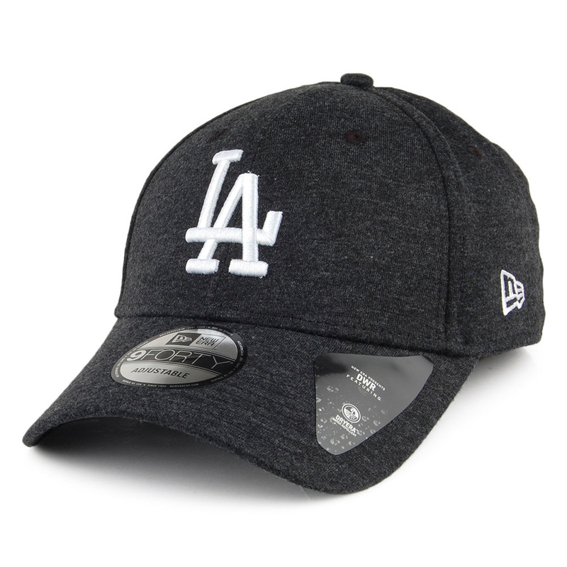 Here is the New Era 9FORTY L.A. Dodgers Baseball Cap in a washed black. The cap features the Los Angeles Dodgers logo embroidered on the front. The New Era flag is embroidered on the left. The team logo is on a patch on the strap at the back.