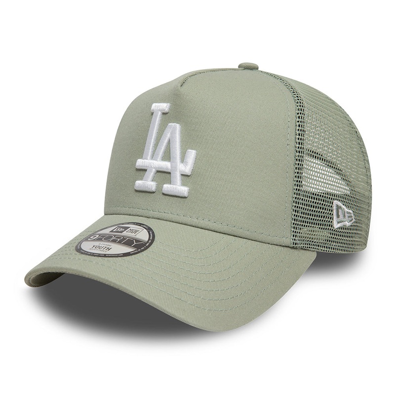 The New Era Kids MLB League Essential L.A. Dodgers A-Frame Trucker Cap in sage-white features the team’s logo embroidered on the structured front panel and the New Era flag embroidered on the left side. The back of the cap features mesh panels for breathability. There is an adjustable snap at the back for a perfect fit.