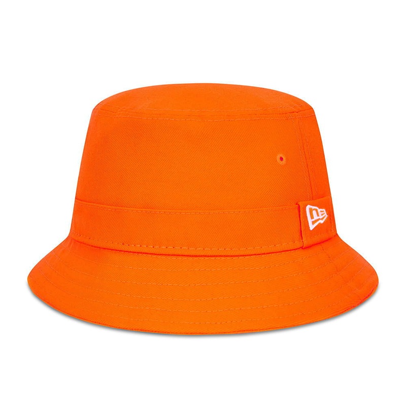 Here is the New Era NE Essential Bucket Hat in orange. The classic bucket has the New Era flag embroidered on the side and eyelets for ventilation. There is a sweatband inside for extra comfort. The hat is packable, making it great for travel.