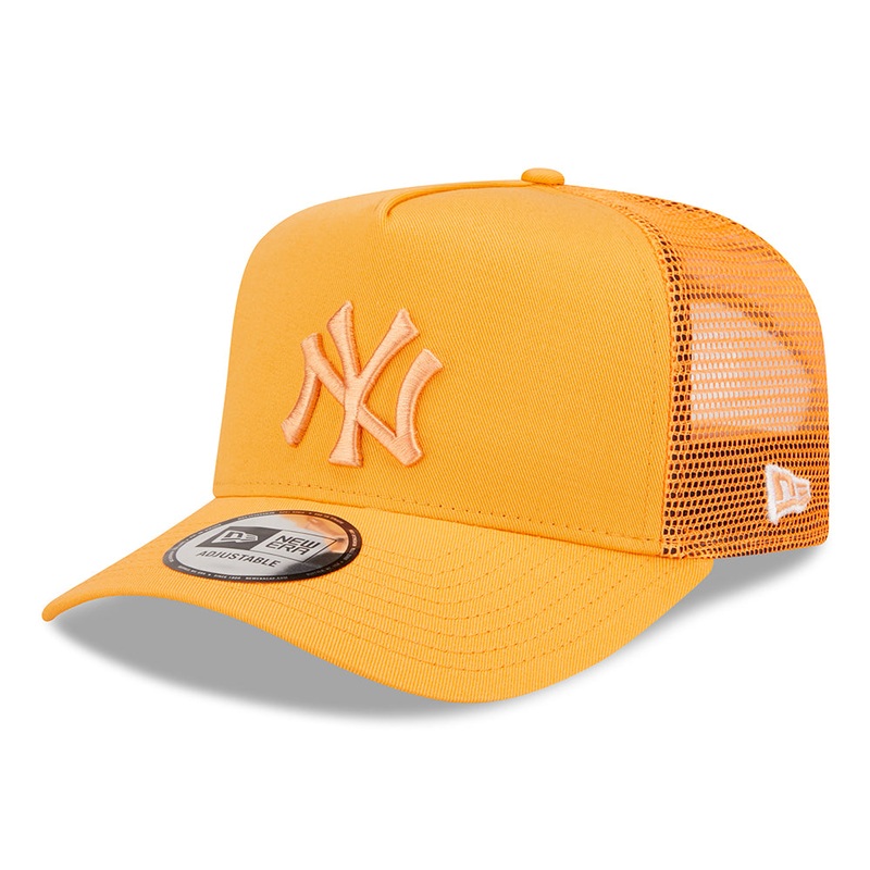 The New Era MLB Tonal Mesh New York Yankees A-Frame Trucker Cap in orange features the team logo embroidered on the structured cotton front and the New Era flag embroidered on the left. An adjustable snap at the back allows a comfortable fit.