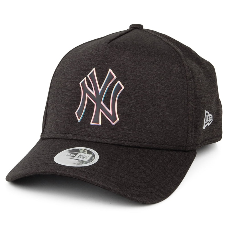 Here is the New Era New York Yankees A-Frame MLB Iridescent Logo Baseball Cap in black. The cap features the Yankees logo with an iridescent outline on the front of the cap. The New Era flag is embroidered on the side. There is an adjustable snap at the back of the hat.