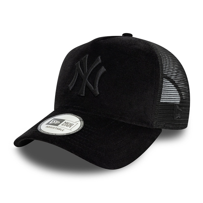 The New Era Women’s 9TWENTY MLB Velour New York Yankees Trucker Cap in black on black features the team logo embroidered on the structured velour front. The New Era flag is embroidered on the left side. The mesh back has an adjustable snap so the hat fits many sizes.