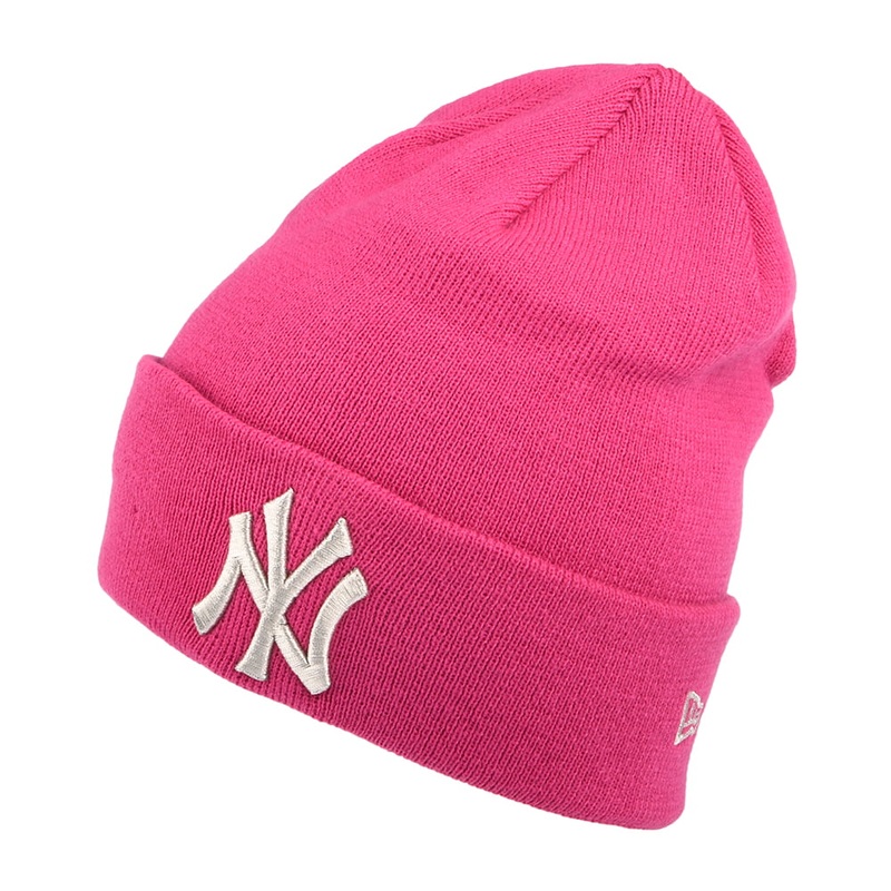 Here is the New Era Women New York Yankees MLB Metallic Logo Beanie Hat in pink. This winter beanie features the teams logo sewn to the front. There is a New Era flag embroidered on the side of the hat and it is double layered for extra warmth. A great hat for every fan.