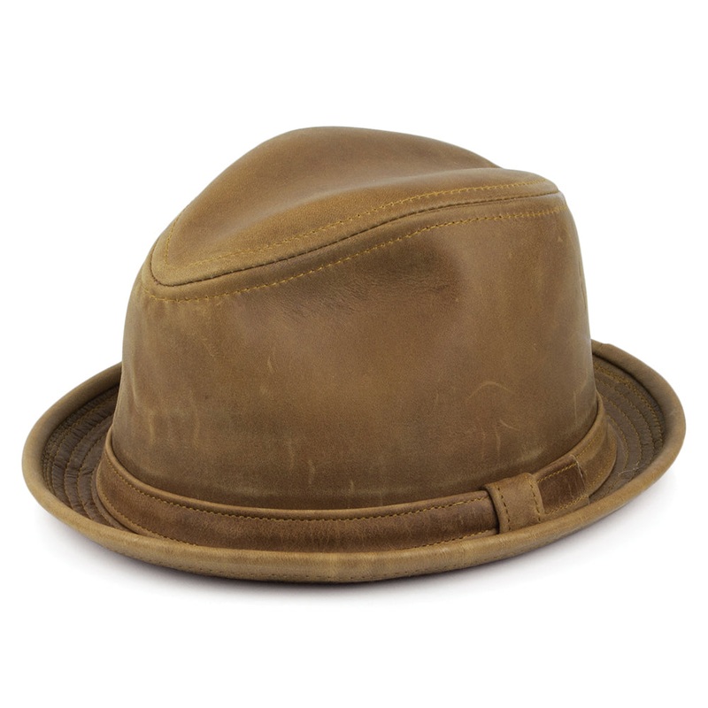 Here is the New York Hat Co. Vintage Leather Trilby Hat in brown. This genuine leather trilby has a snap brim that can be turned up or down depending on your style. The hat is satin lined and has a cotton sweatband. This style is leather, so there can be marks and scuffs on the hat are visual proof this item is made of genuine leather. In no way do these natural markings affect the strength, quality and beauty of the leather.