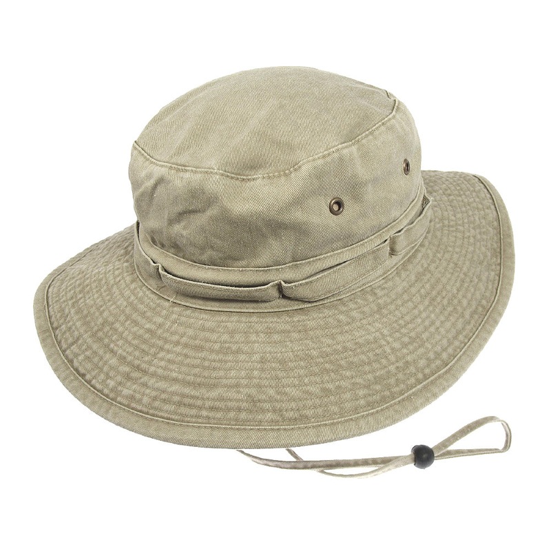 Here is a 100% cotton boonie in putty from Jaxon & James. The hat is great for everyday wear as well as for travelling. 100% washed cotton twill is soft yet durable. The 7cm wide stitched brim surrounds a 9cm high square crown. A pair of brass eyelets on each side of the crown provides ventilation under the hot sun. A self band provides spots for buttons or small outdoor tools. Adjustable chinstrap with toggle allows you to secure the hat onto your head.