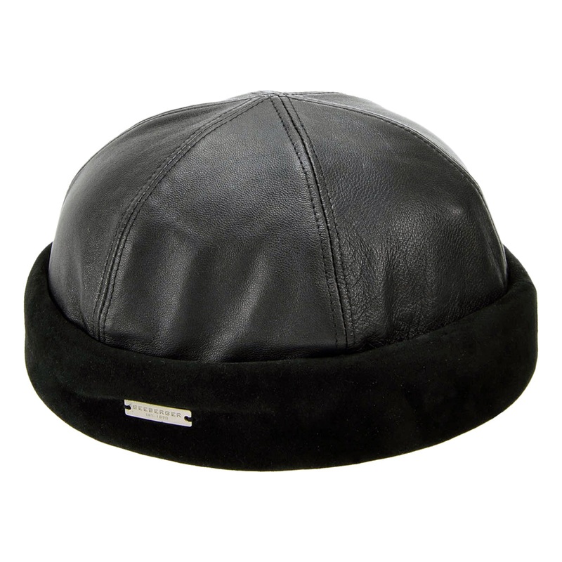 Here is the Seeberger Leather Docker Beanie Hat in black. This unique docker beanie style has a short 6 panelled crown made of smooth lambskin and a suede rolled up cuff finished with a Seeberger badge sewn on the side. This is a great style for those looking for something stylish and different.